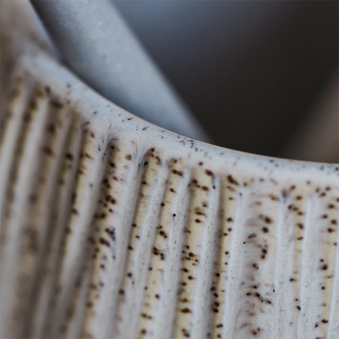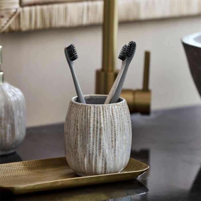 The toothbrush holder from House Doctor is made of off-white, grooved stoneware and has a beautiful speckled glaze that gives it a lively and handmade look. The soft round shape makes it comfortable to have standing out and creates a calm detail in the bathroom. The holder is ideal for toothbrushes, but can also be used for makeup brushes, cotton swabs or as a small hideaway for a green plant. The robust stoneware provides stability and makes the holder easy to clean in everyday life. With its neutral color tone, it fits into both modern and classic bathroom environments and adds a nice balance between function and aesthetics.