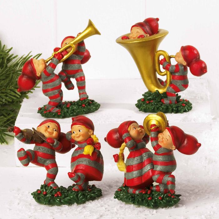 Baby elf with instrument. The baby elves found instruments and are in a Christmas mood. Available in 4 variants with either a trumpet, a tuba, a violin, or cymbals. The baby elves measure approx. 6 cm in height.