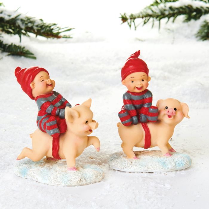 Baby elf on piglet. Baby elf riding a piglet is available in 2 variants, both with a happy baby elf. The baby elf is made of polyresin. It measures 10 cm in height.