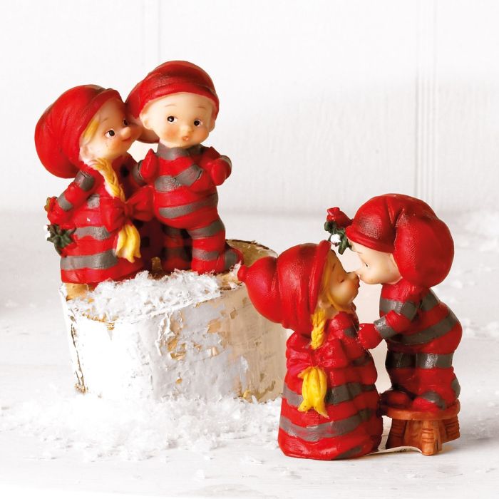 Baby elves romance. Baby elves kissing under the mistletoe or whispering with mistletoe behind the back. The baby elves measure 6 cm in height. Made of polyresin.