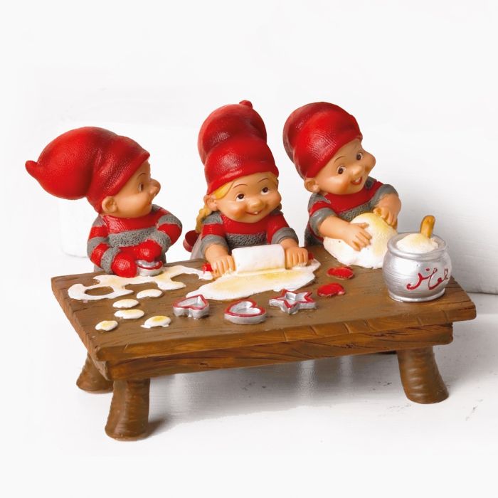 Babynisserne bager julesmåkager ved køkkenbordet. Der er gang i kagerulle og udstiksforme.