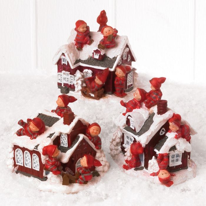 House with baby elves. Small decorative houses with playful baby elves on the roof and outside in the snow. Available in 3 variants with the baby elves placed in slightly different places. Made of polyresin. The house measures 8 cm in height.