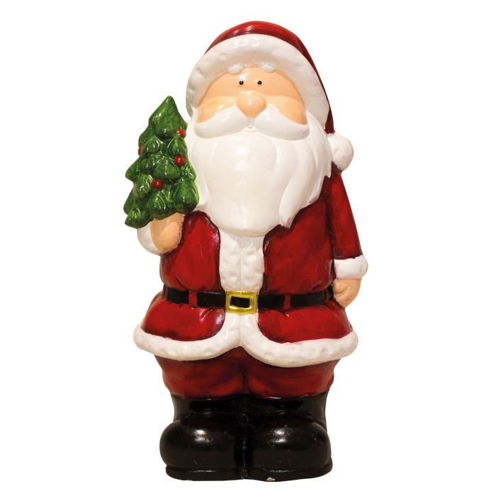 Large Santa Claus with a classic Santa outfit, big white beard and a Christmas tree on his arm. Santa Claus measures 44 cm in height. Made of magnesium oxide.