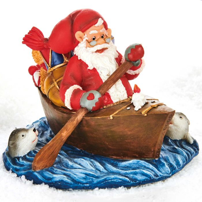 Santa in a kayak. Santa Claus traveled to Greenland, where the country offers, among other things, beautiful nature seen from the kayak. Santa Claus measures 11 cm in height, and the figure has a width of 16 cm. Made of polyresin.