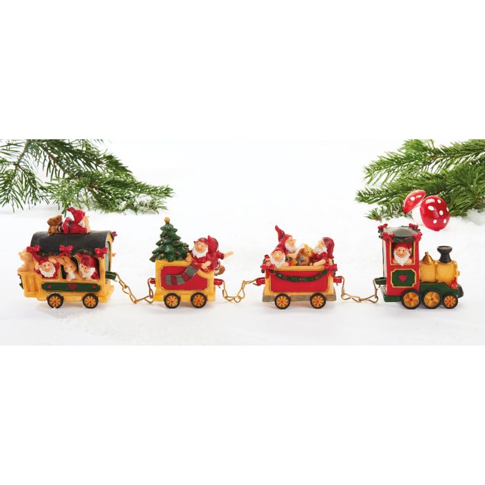 Forest elf train with a locomotive, three wagons, lots of forest elves and Christmas atmosphere. It measures 9 cm in height and 40 cm in length.