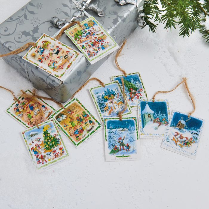 Gift tags featuring motifs designed by Vilhelm Hansen. The gift tags are part of the new series, showcasing Christmas elves with large red hats and forest animals.