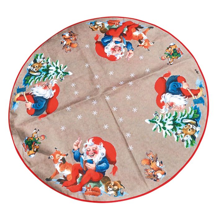 Christmas tree rug with elves and forest animals designed by Vilhelm Hansen. The rug has a red edge. The Christmas tree rug has a diameter of 110 cm. Made of polyester.