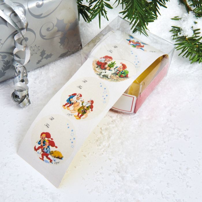 Roll of 100 adhesive gift labels designed by Vilhelm Hansen. The new series features Christmas elves with large red hats and forest animals.