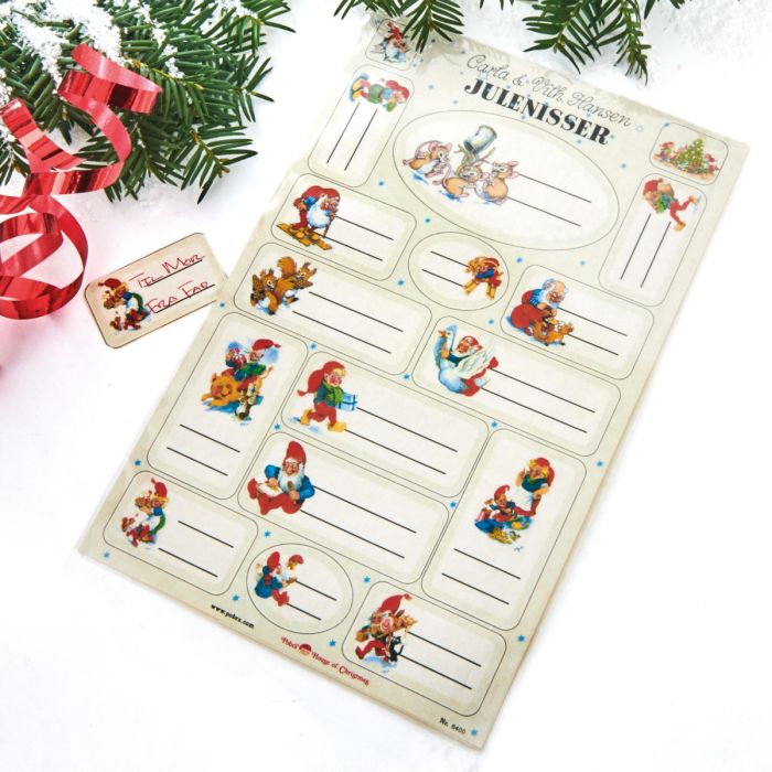 Adhesive gift labels with Vilhelm Hansen's elf design. There are two sheets of adhesive gift labels per bag, ready to be placed on Christmas presents.