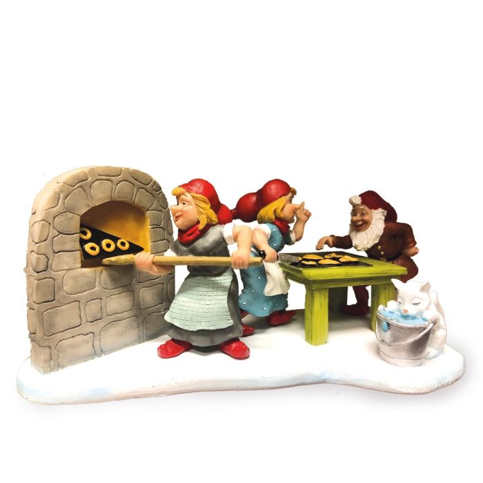 There is a lot of activity at the stone oven as Christmas cookies are baked on an assembly line. The figure is part of Vilhelm Hansen's new series of Christmas elves with big, red hats and forest animals.
