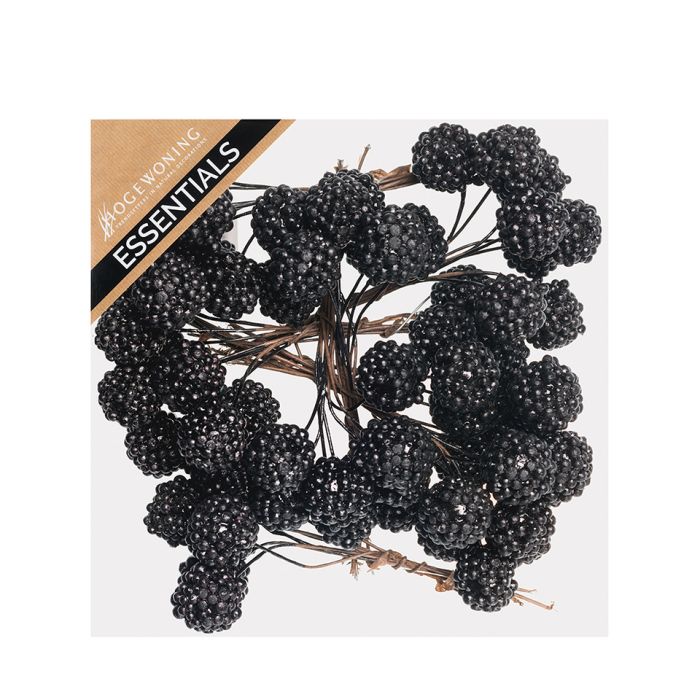 Blackberries with wire. Small, black artificial blackberries with a metal wire to stick into the wreath, clay, ground, etc. There are 8 clusters of 8 blackberries each per bag. Made of styrofoam and metal.