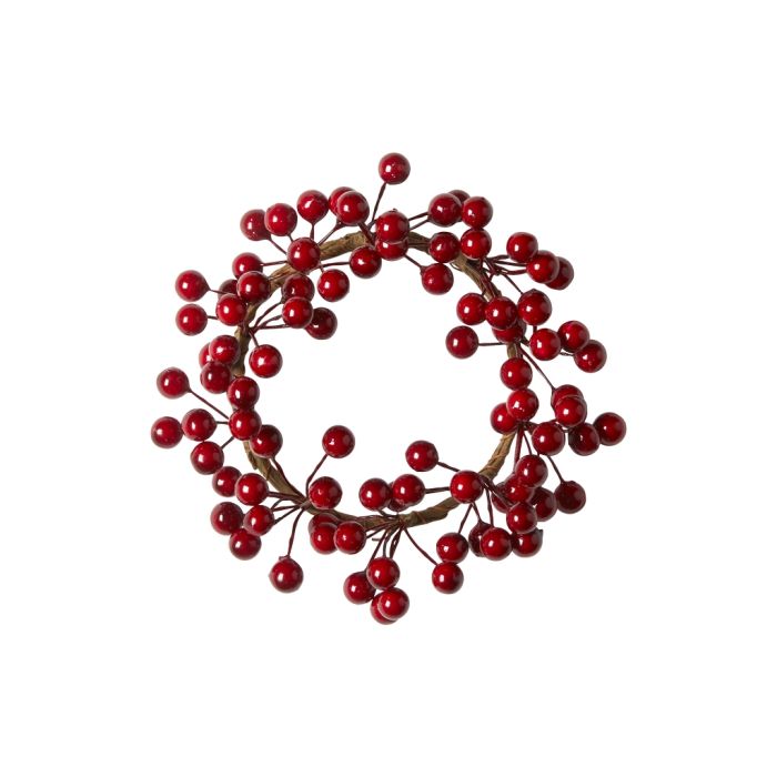 Bærkrans med røde bær fra Speedtsberg. Kransen kan både hænges op og bruges liggende fx rundt op et bloklys. Fås i tre størrelser.