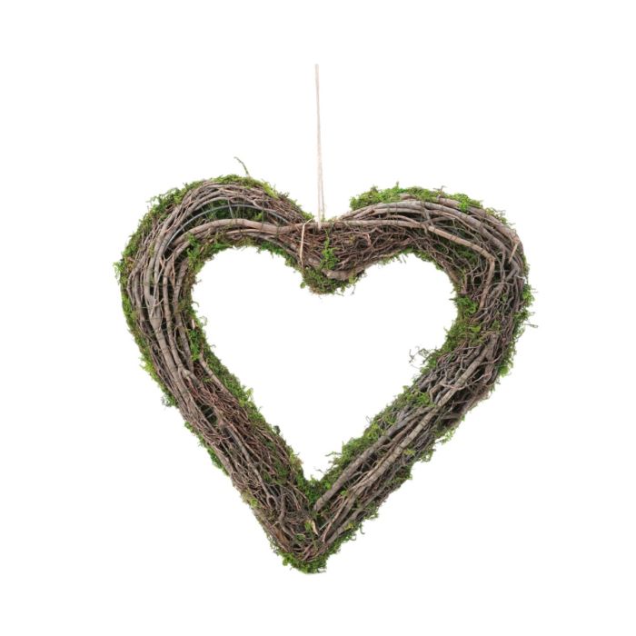 Branch heart with moss details and string for hanging. The heart can be hung directly on a door or wall as a simple decoration, but it also works perfectly as a base for creative decorations. Decorate it with flowers, ribbons, pine cones or small seasonal details, whether for a wedding, Easter, autumn or Christmas. Since it is made of durable natural materials, it can be used again and again, both as a year-round decoration and for special occasions. The heart is available in several sizes.