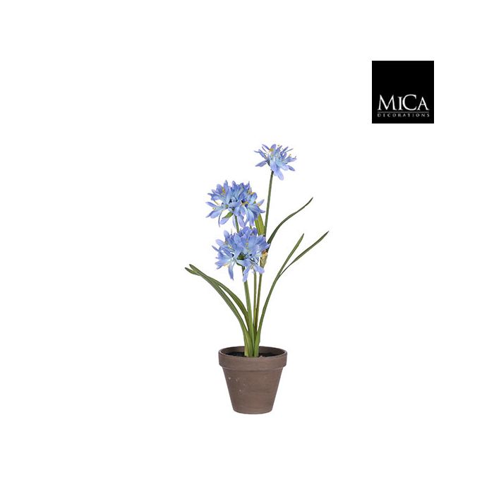 Med sine blomstrende skærme af lyseblå blomster står denne skærmlilje i fuldt flor. Planten er naturtro med lange, slanke grønne blade og kommer i en dekorativ, grå lerpotte. Sæt fx den blomstrende sommerblomst på steder med stærk sol, hvor almindelige haveplanter, har det svært.