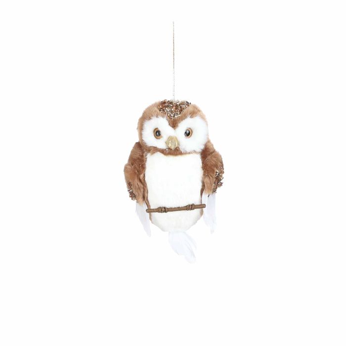 White/brown owl. Cute plush toy depicting an owl sitting on a stick. The plush toy has a string that can be hung from the ceiling.