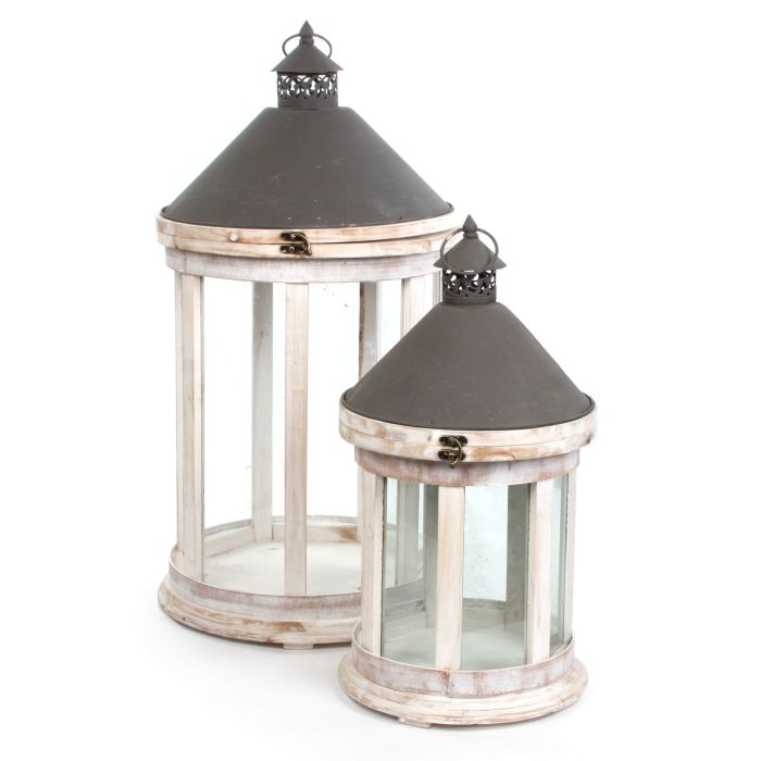 Exclusive lantern set in 2 sizes. Measurements: Large - L: 28 cm, B: 28 cm, H: 53 cm, and Small - L: 37 cm, B: 37 cm, H: 72 cm.