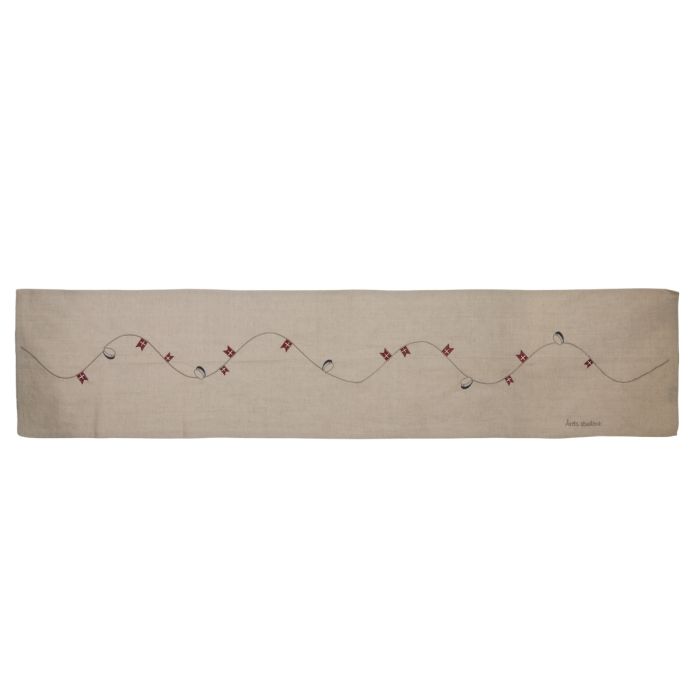 Festive, linen-colored table runner for the student party with small embroidered Danish flags and blue student caps from Speedtsberg.