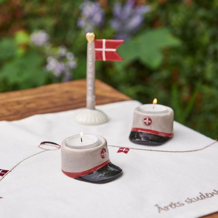 Festive, linen-colored table runner for the student party with small embroidered Danish flag and student caps from Speedtsberg.