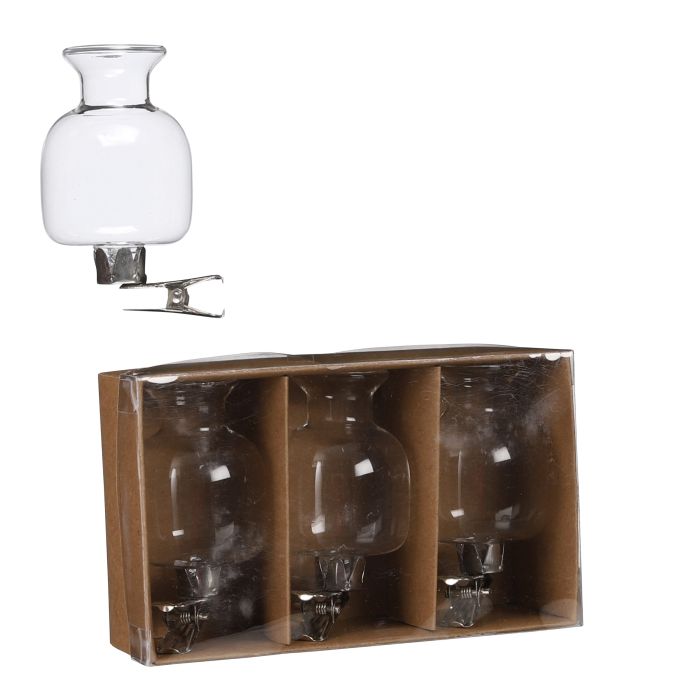 Glass vases with clips. Set of 3 small glass vases. The vases can be used both on branches and on our hanging metal. Measurements: H: 6 cm D: 4 cm.