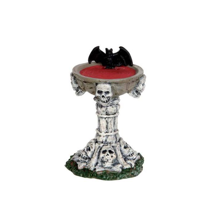 Bat Bath: A bird bath decorated with bones and skulls. Measures L 4.2 cm x W 4.2 cm x H 6.5 cm.