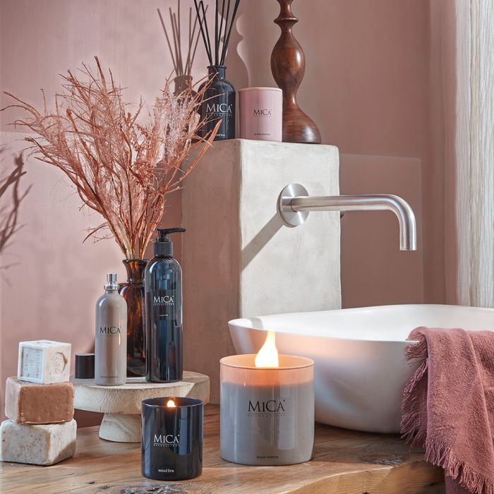 Mica wood fire scented candle in a black glass jar with wooden lid. The wooden lid can be placed under the candle when it is lighted up. It creates a cozy atmosphere in the bathroom and goes well with the matching hand soap. The scent is rich with an earthy note. The main notes are citrus, strawberry leaves and rosemary. The underlying fragrance notes are a wonderful mix of clover, cinnamon, cedar, sandalwood and vanilla. All carefully selected. It measures 8.5 cm in height and has a diameter of 7.5 cm. The burning time is approx. 36 hours.
