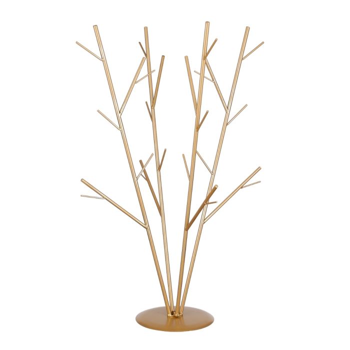 Golden metal decorative tree with a wide, solid, round base and 4 large "branches" with "twigs" on them. The decorative tree can be used all year round.