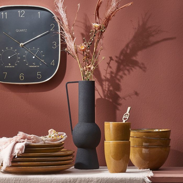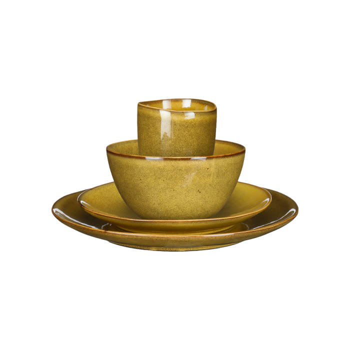 Tabo dinnerware set with 16 pieces for 4 people in a beautiful ochre color from Mica Decorations. Handmade ceramic tableware, where no two pieces are exactly alike. Robust dinnerware with beautiful, rustic surfaces. The set consists of 4 dinner plates, 4 lunch plates, 4 bowls and 4 mugs.