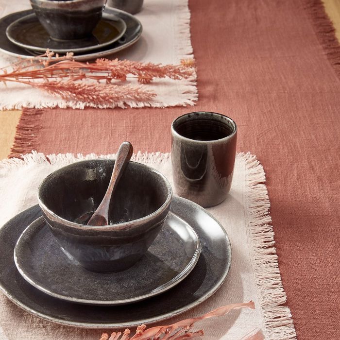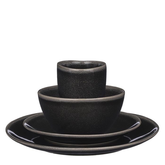 Tabo 16-piece dinnerware set for 4 people in a black shade from Mica Decorations. Handmade ceramic tableware, where no two pieces are exactly alike. A robust dinnerware set with beautiful, rustic surfaces. The set consists of 4 dinner plates, 4 lunch plates, 4 bowls and 4 mugs.