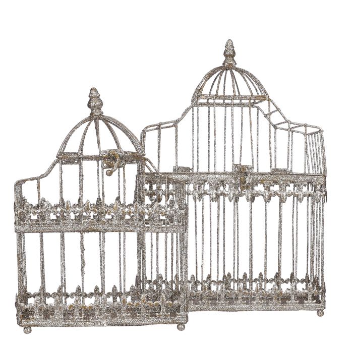 Set of 2 champagne coloured bird cages. The bird cages are made of metal. The largest measures 40 cm in height and has a length of 26 cm.