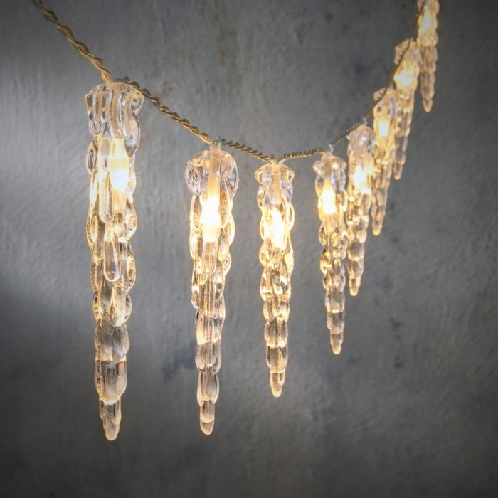 String of lights with 10 icicles with classic white light. The string of lights has a battery box with timer. Cozy lighting, for example, over the Christmas landscape or in winter decorations.