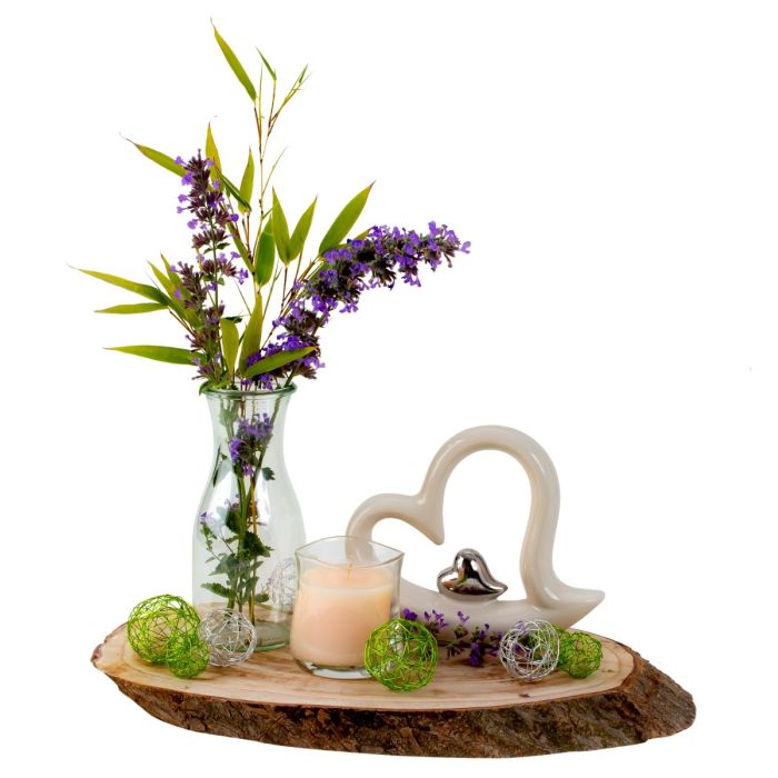 Small wooden disk with annual rings and bark edge. Suitable as a decorative item or as part of a creative arrangement.