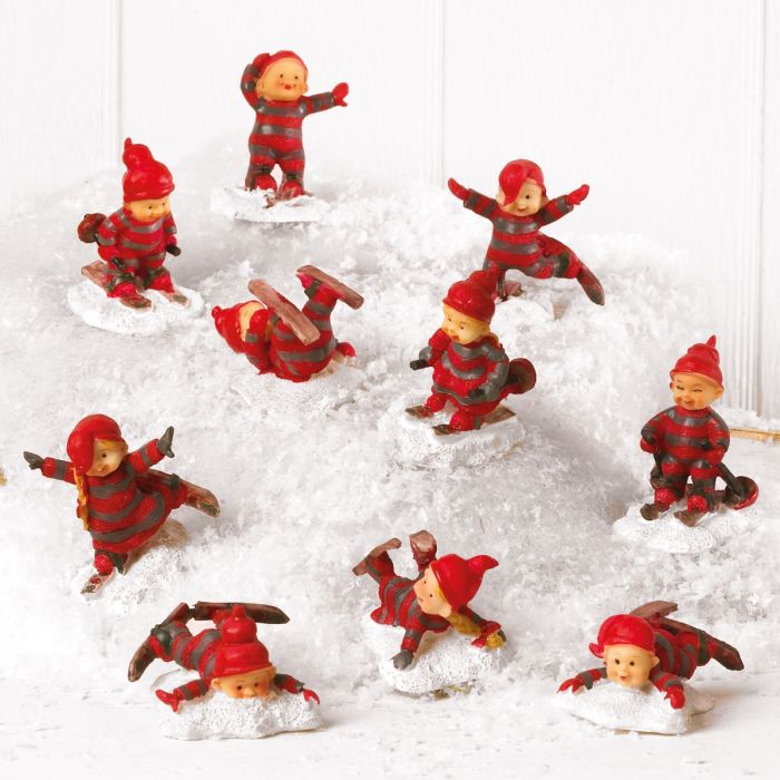 Baby elves on skis. It measures 4 cm in height. 5 different pieces per box.