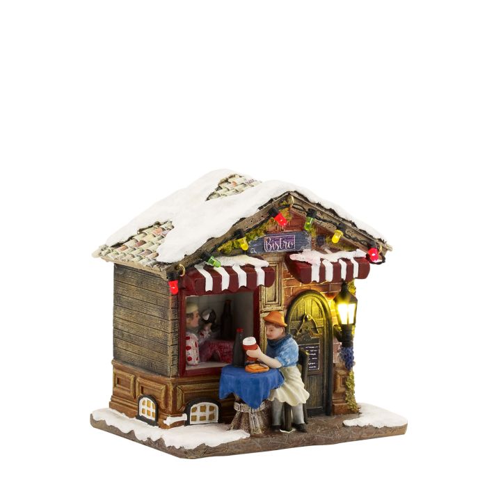 Luville Bistro with light in the old lantern and multi-colored light chain.