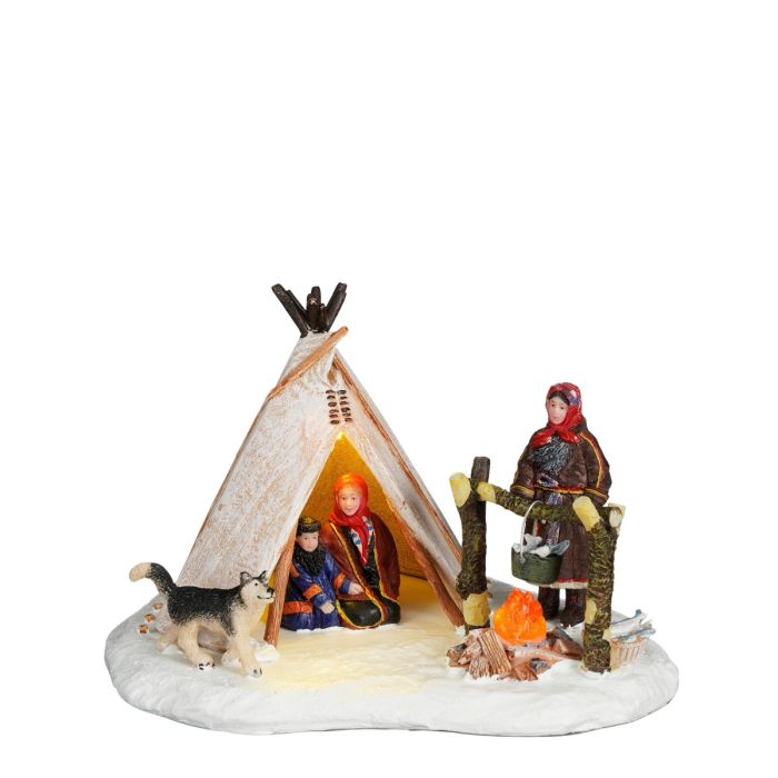While the children warm up in the tent, mom stands by, preparing delicious food over the campfire. I wonder if the dog hopes for a taste test?
