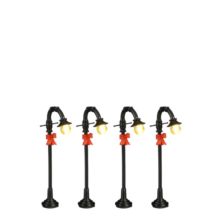 Four black street lights with red bows. The lights are on the same wire. Provides cozy lighting in the Christmas landscape.