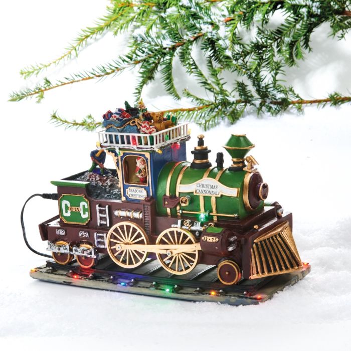 Old fashioned style locomotive with coal. The locomotive has lighted rails and can make sounds. A small Santa Claus can be seen in the cab with Christmas presents that are loaded on top of it. Lots of nice details. The locomotive can be connected to a 230V. It measures 32 cm in height.