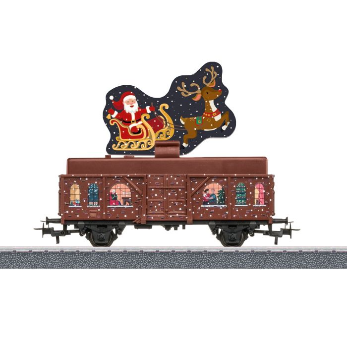 Christmas decorated, gingerbread brown freight car with a silhouette of Santa Claus in the sleigh to put on top of the train car. The train car has pre-programmed atmospheric Christmas sounds, but it is also possible to record and play your own Christmas melody.
