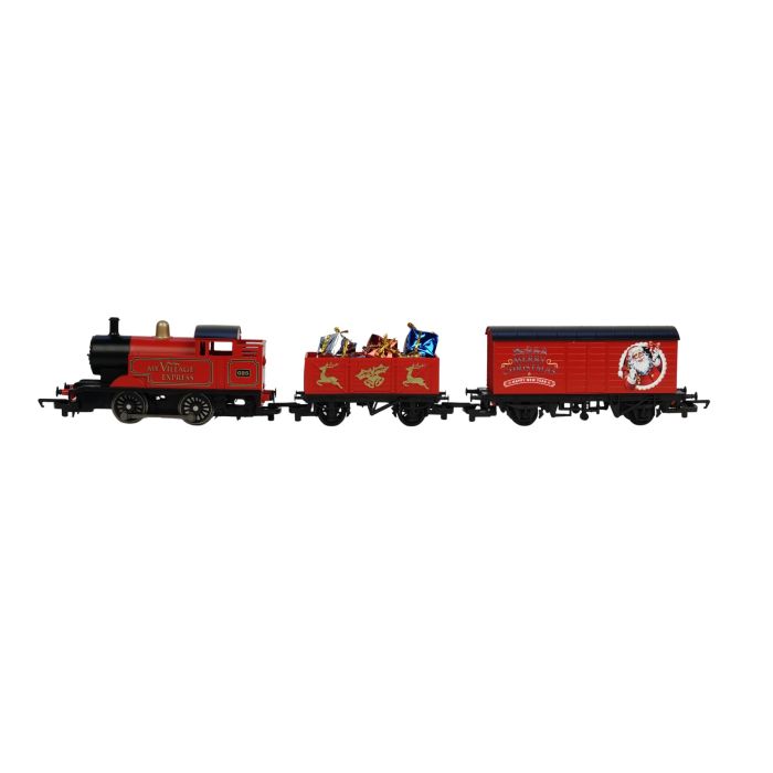 A locomotive, a closed train carriage, an open train carriage, curved rails, straight rails, remote control/controller and adapter are included.