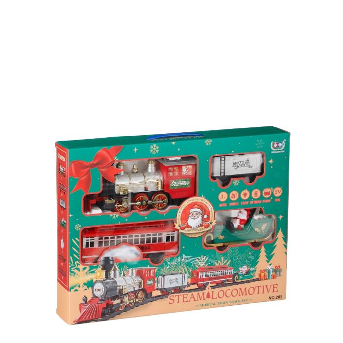 Train with lighted headlight and realistic steam locomotive sound. The train set consists of 1 locomotive, 1 carriage, 1 sleigh, 1 tender, straight rails and curved rails to build the train track with.