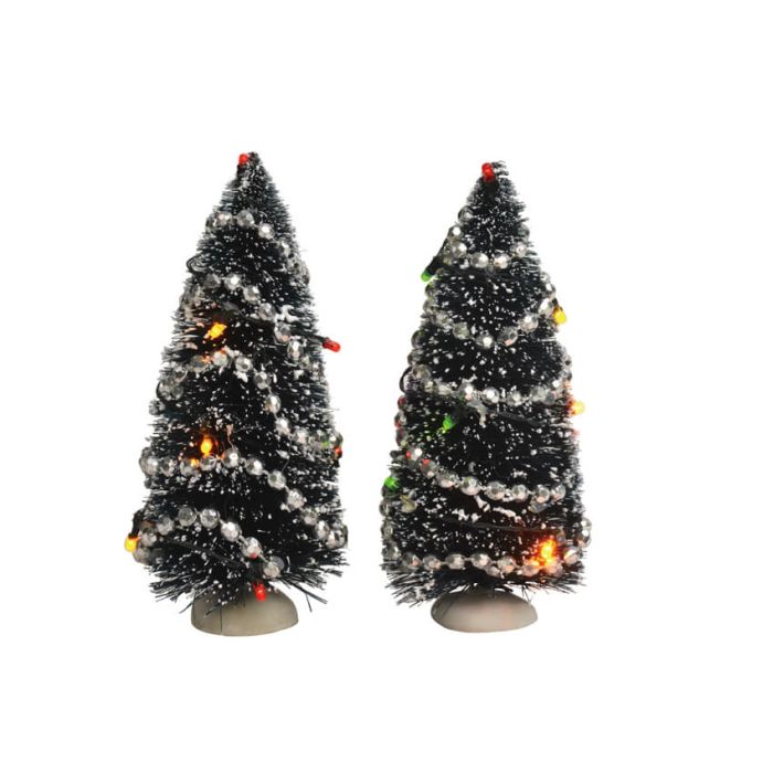 Luville Christmas trees with lights and decorations. Batteries not included. The trees measure 15 cm in height.