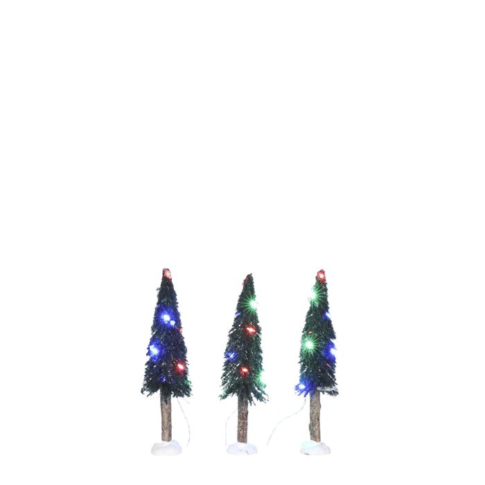 This is a set consisting of 3 bristle trees with lights in various colors. Uses AA batteries (batteries not included). Measures: L: 4 cm x H: 14 cm x D: 4 cm.