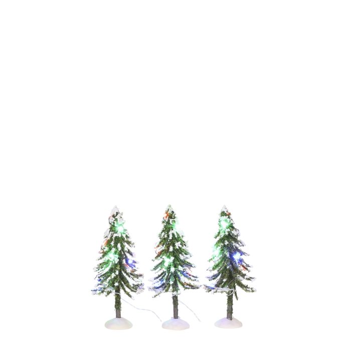 This is a set consisting of 3 snow-covered trees with multi-colored lights. Battery-operated (batteries not included). Measures: L: 0 cm x H: 0 cm x D: 0 cm.