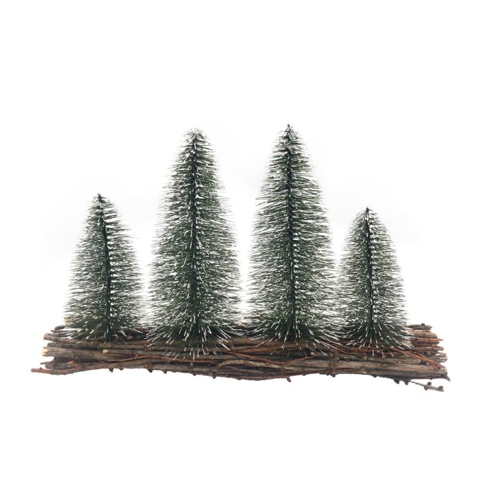 Four conifers with white "snowdrifts" on a base of bundles of thin twigs. Good as a separation in the Christmas landscape or as a decoration with figures, for example on the windowsill.