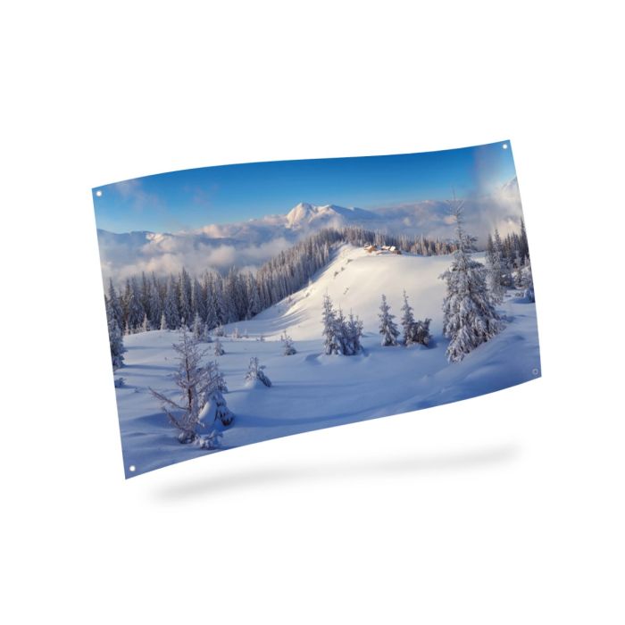 Large backdrop with winter forest. Made of fabric. Easy to hang up. It measures: L: 300 cm x H: 150 cm.