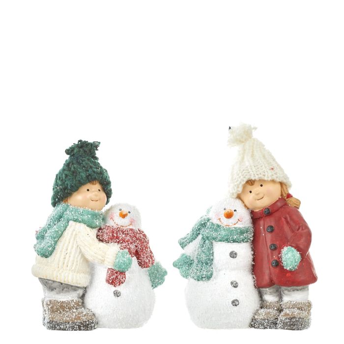 Winter children with snowmen. Winterly dressed boy or girl with a snowman. The snowman have small star shaped holes through which light comes out if there is a tealight candle. The winter children with snowmen measure 13 cm in width and 17 cm in height. Made of polyresin. Select the desired variant.