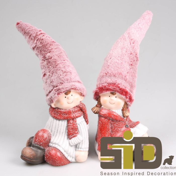 Sitting winter children. The sitting children are wearing winter clothes and snow-dusted hats. It measures 17.5cm x 15cm x 21cm. Available in 2 variants: boy or girl.