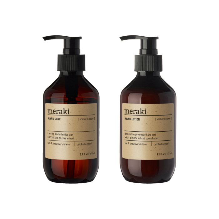 The Northern Dawn gift box from Meraki contains a hand soap and a hand lotion in the classic brown pump bottles with 275 ml each. The series is organically certified according to the COSMOS standard by Ecocert and is characterized by a fresh scent, where orange meets warm woody notes and a soft balsamic undertone. The hand soap gently cleanses the skin and contains extracts of carrot and parsley, which provide gentle, natural care. The lotion has a creamy consistency and is enriched with almond oil and cocoa butter, which leaves the skin well-nourished and supple. The set is ideal as a hostess gift, almond gift or as a caring gesture for someone you want to pamper. A well-balanced and fragrant set for both the kitchen and bathroom.
