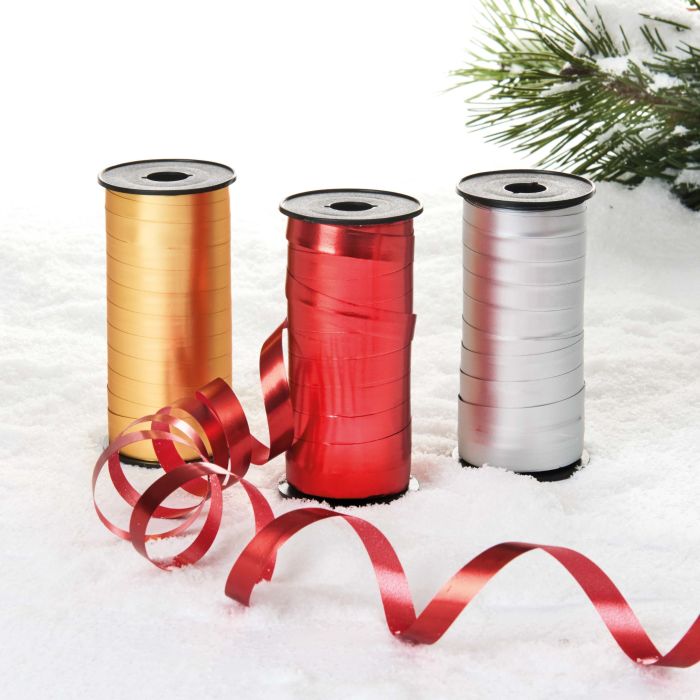 Gift ribbon. Available in 3 different colours: gold, red or silver. The gift ribbon has a width of 1 cm and there are 50m per roll.