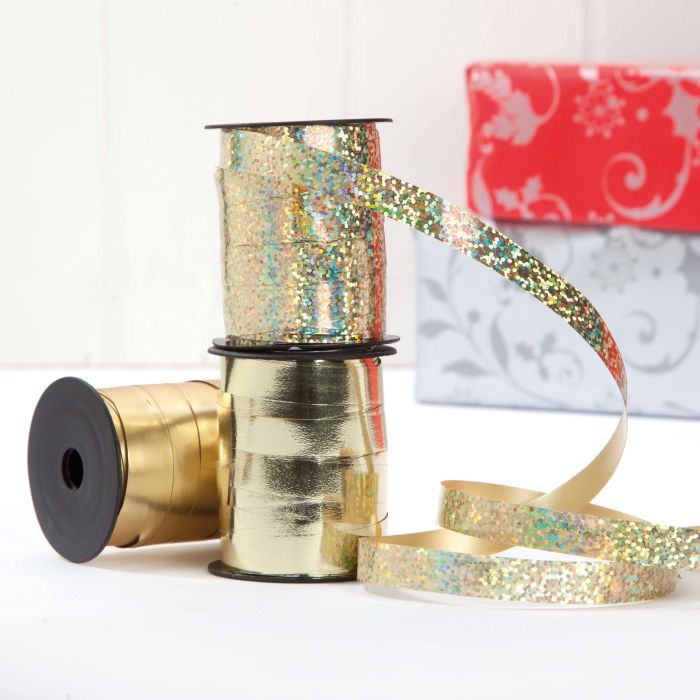 Gold colored gift ribbon. Available in three variants: matte, shiny or patterned. The gift ribbon measures 1 cm in width and there are 10 meters per roll.