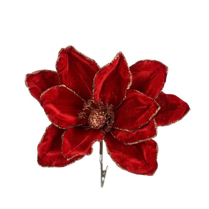 Magnolia flower head in a beautiful red color with gold-colored details and a practical clip/clamp, so it can be easily attached to napkins, wreaths or Christmas tree branches. Our flower clips are very popular as table decorations on the Christmas table. The magnolia flower is also available with a stem.